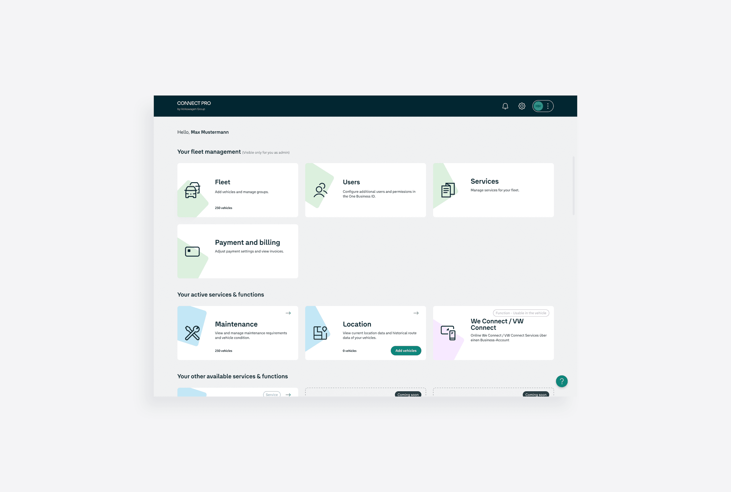 A unified platform centralizing fleet operations for Volkswagen managers.