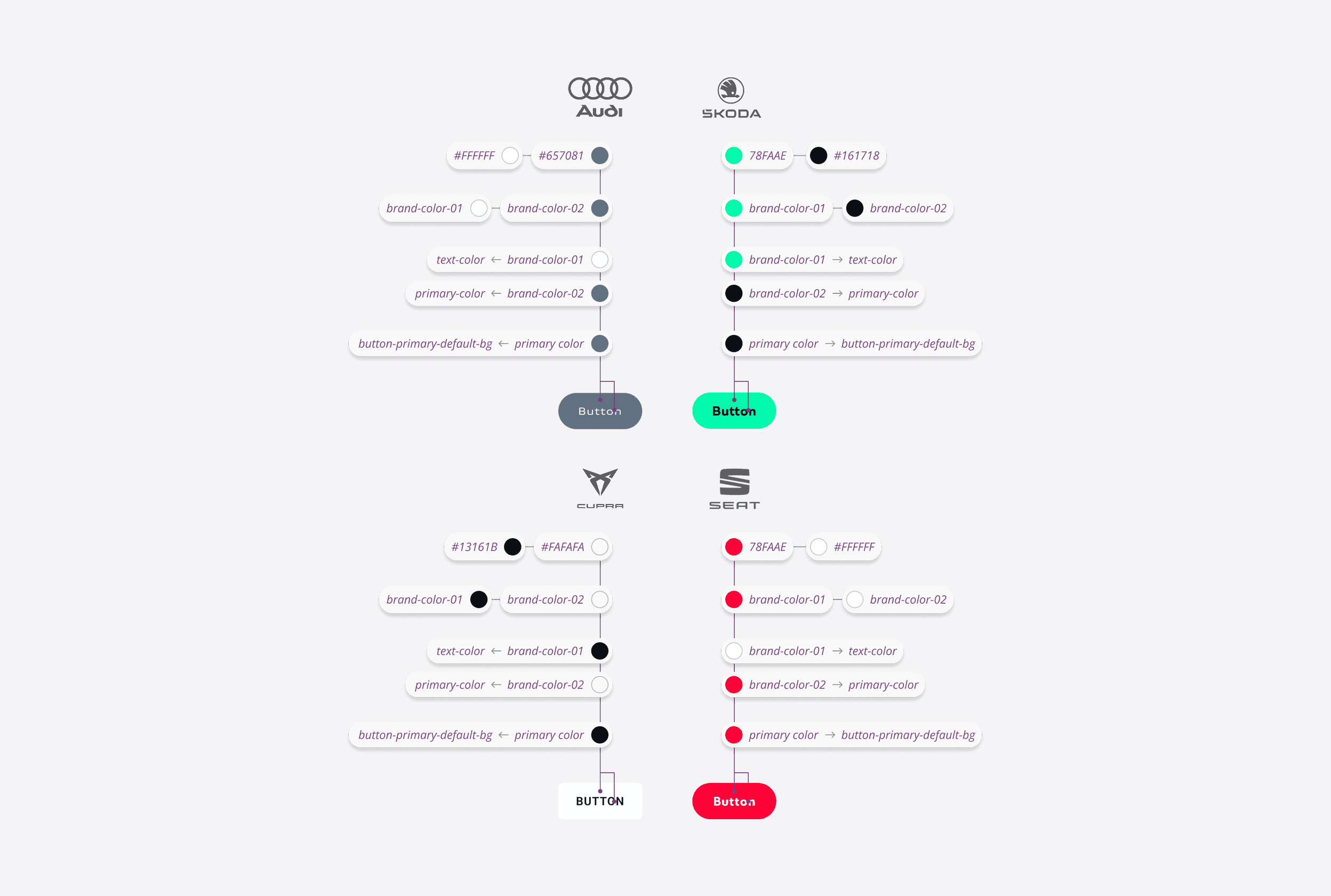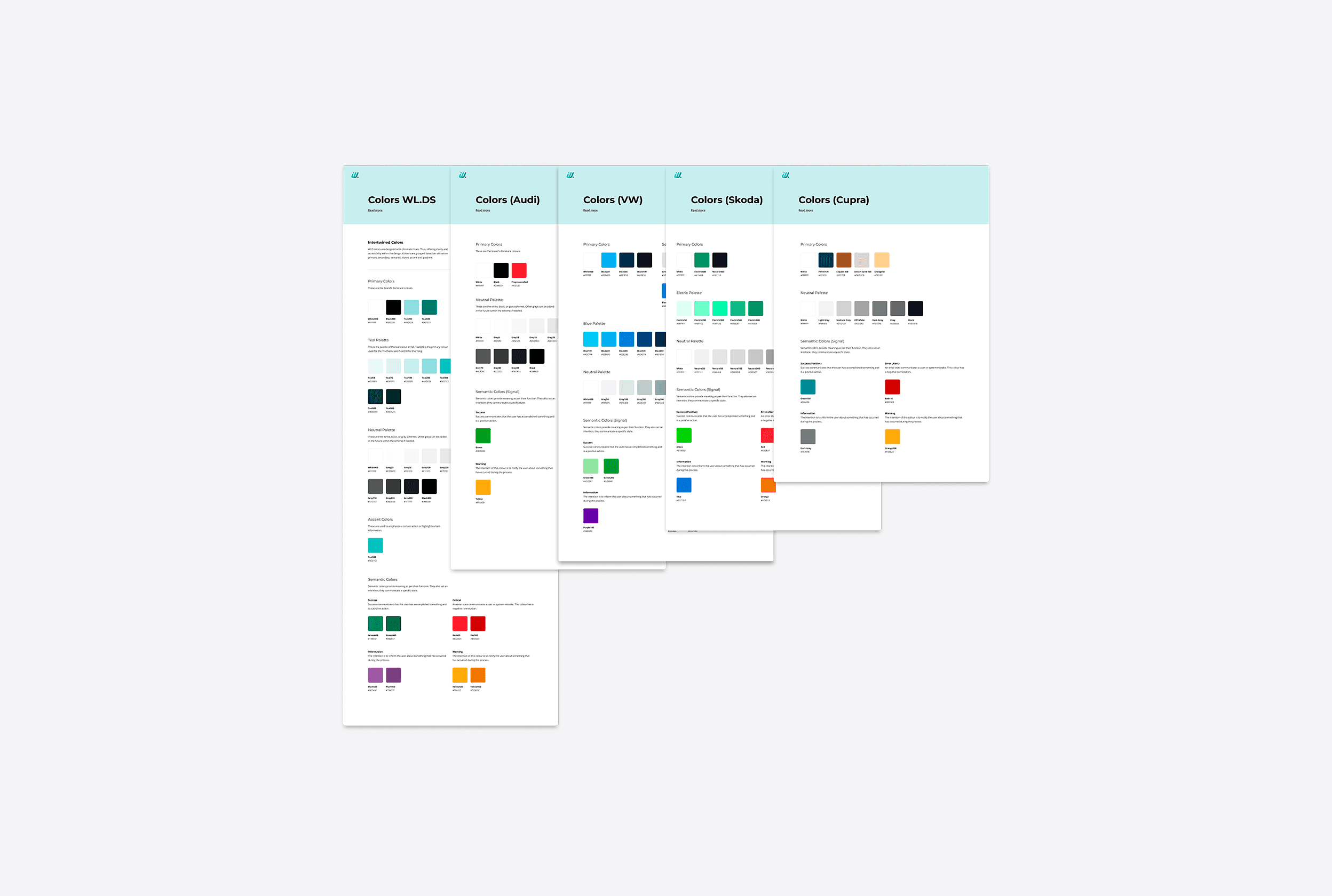 VW needed 5 simple colors. Audi required 10+ including gradients. SEAT had 8 with unique hierarchy. Any system had to accommodate this range without forcing brands into a rigid structure.