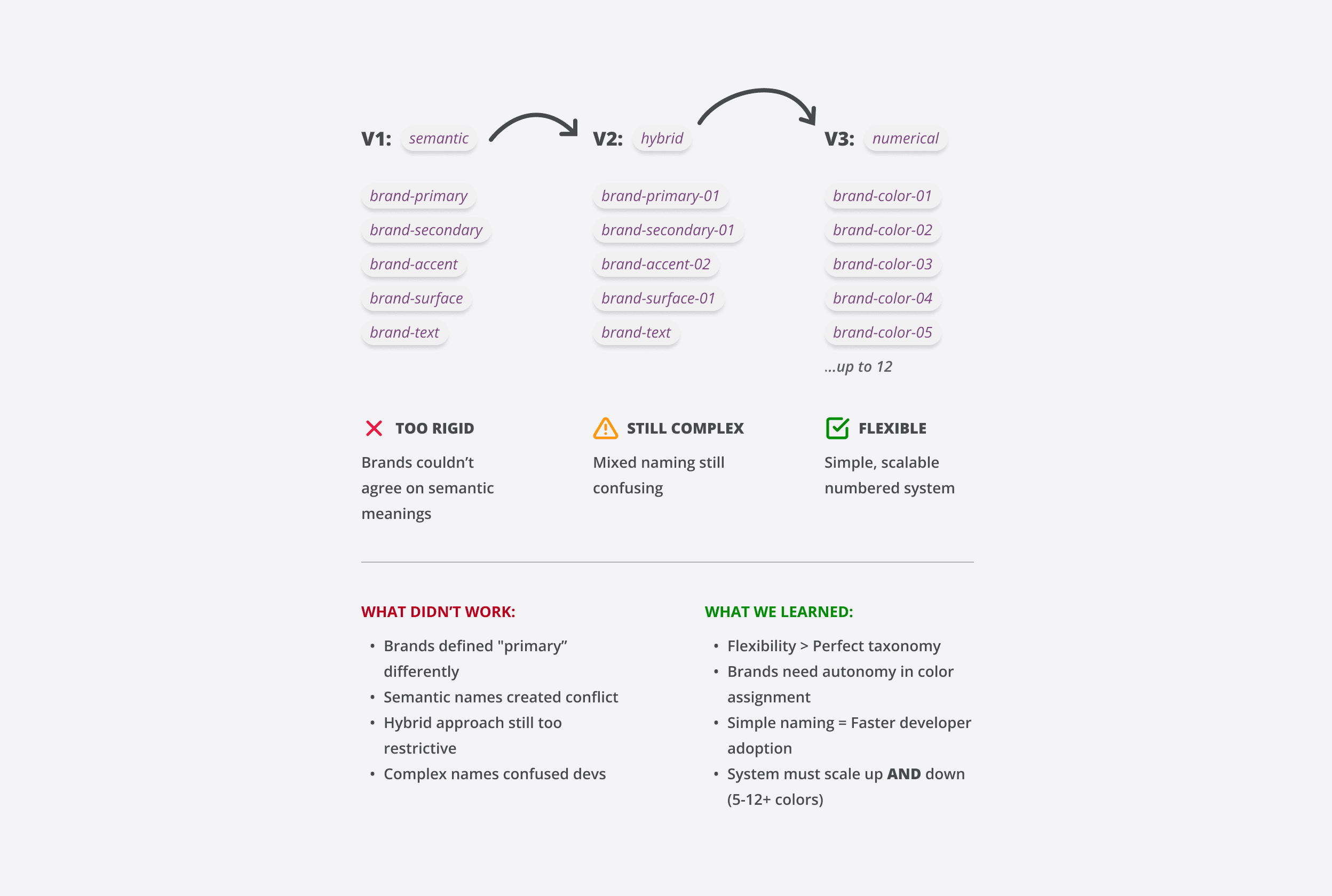 I explored multiple token naming strategies, prototyping each in Token Studio and presenting to brand teams. Each iteration taught us something new about what brands actually needed versus what seemed theoretically correct.