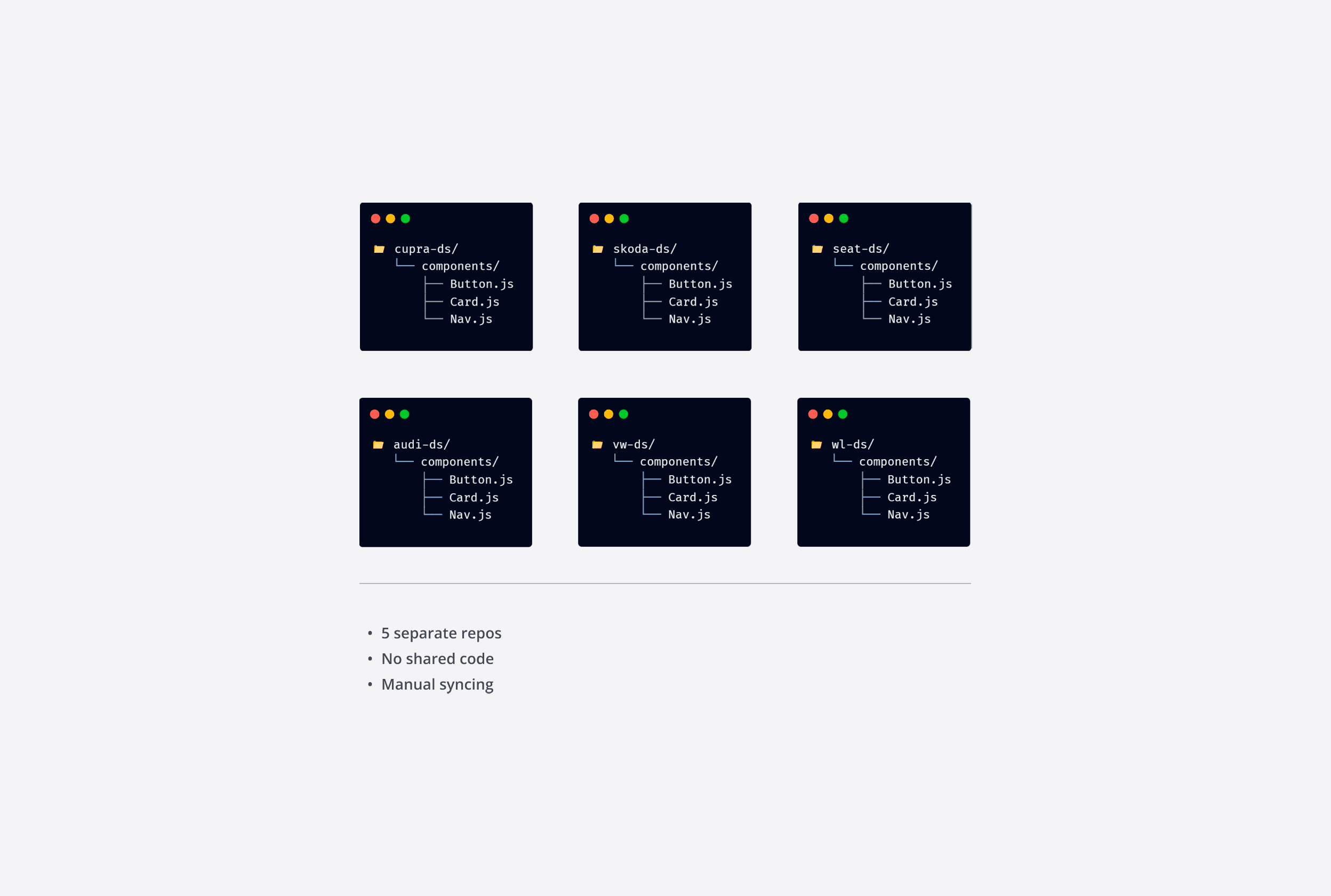Each VW Group brand was building e-commerce experiences independently, duplicating effort on common patterns like product browsing, filtering, and checkout. This led to inconsistent quality, slow deployment, and wasted resources. The challenge was creating something flexible enough to respect each brand's visual identity while maintaining shared functionality and quality standards.